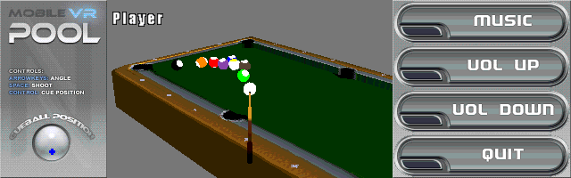 | Mobile VR Pool | I assume VR stands for Virtual Reality, and that's what this is: a quite playable pool game for mobile phones. You can also choose some music to be played on the background. |  |